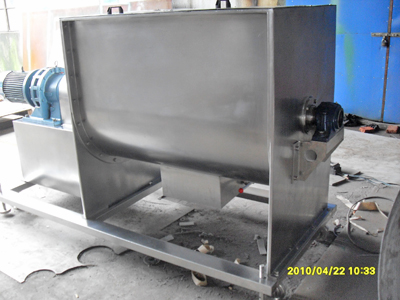 描述: 原理: 外螺旋带盘绕形式配合旋转方向把物料从两端向中间推动,而内螺旋带把物料从中间向两端推动,形成对流混合. 物料在相对短的时间混合均匀. 设备应用于干粉,颗粒,液体与低粘度的浆料.